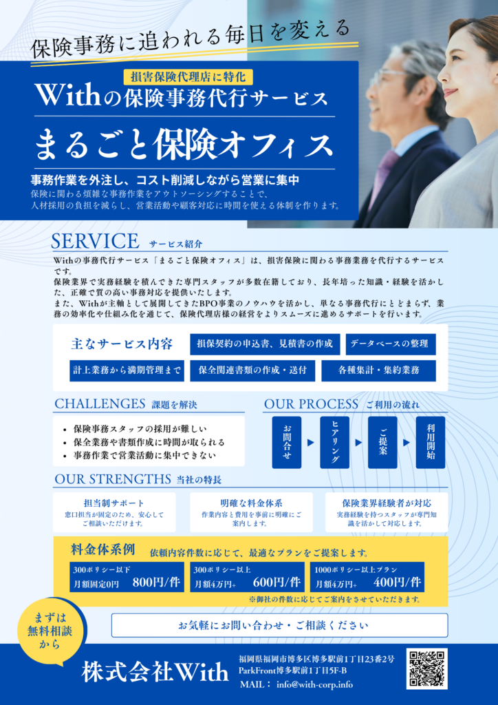 株式会社Withでは、これまでBPO事業を通じて培ってきた業務設計や効率化のノウハウを活かし、損害保険事務業務のアウトソーシングサービスを提供いたします。